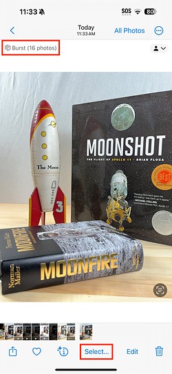 A burst is saved in the Photos library as a single group of shots, regardless of how many frames you shot. Tap Select to view them all. Tap to select your favorite images from the bunch, then tap Done, at which point you’re asked if you want to keep the entire set or only the ones you selected.