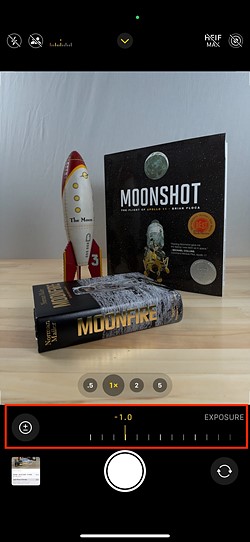 To do that, tap the carat (^) button at the top of the screen to reveal the additional controls, then tap the (+/–) button to display the Exposure slider. Drag to the left or right to decrease or increase the value. A new badge at the top of the screen indicates the EV amount. That compensation stays fixed while you’re shooting until you reset it (tap the badge to display the slider again).