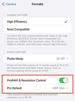 You can capture either 48MP in the ProRAW Max mode or 12MP using the ProRAW 12 setting. When shooting Raw, 24MP is not an option. That resolution is possible only when shooting HEIF or JPEG because the camera captures multiple 12MP exposures and computationally combines them with a 48MP image.