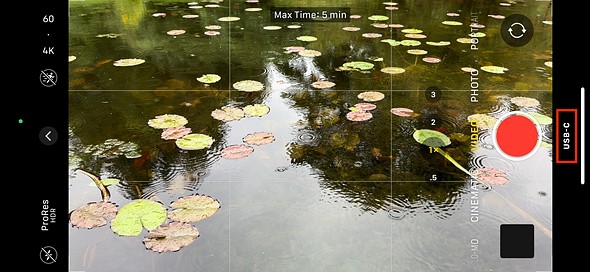 Lastly, make sure the external device is plugged in and the Camera app is reading it. You should see “USB-C” near the port.