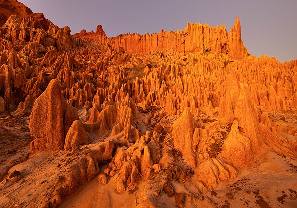 A Red Tsingy “castle” shining under a strong post-sunset glow.
