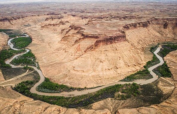 The White River winds its way through the Uinta Basin in northeast Utah. Fracking sites, the Deseret Power Plant and the Uinta Mountains in the background. Photo: Russel Albert Daniels |