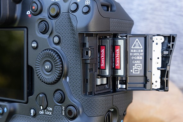 The EOS R1 has dual CFexpress type B card slots supporting capacities up to 2TB. Instead of being accessed through a door on the back of the camera like the 1D X III, cards now load through a door on the right side of the body, similar to the R3. The camera includes a 2.5 GBASE-T Ethernet port and 802.11ax Wi-Fi support for direct connectivity. This is the new WiFi 6E standard that promises faster connections, in part by using the parts of the 6GHz spectrum, in addition to the 2.4GHz and 5GHz regions currently in use.