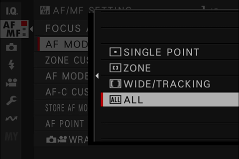 The X-T50 has several autofocus selection modes: in AF-S mode, it has six sizes of single point and zone, as well as a wide mode that samples the entire frame. Switch to AF-C, and the wide selection is swapped out for a tracking mode that will stick to whatever you put it on.
