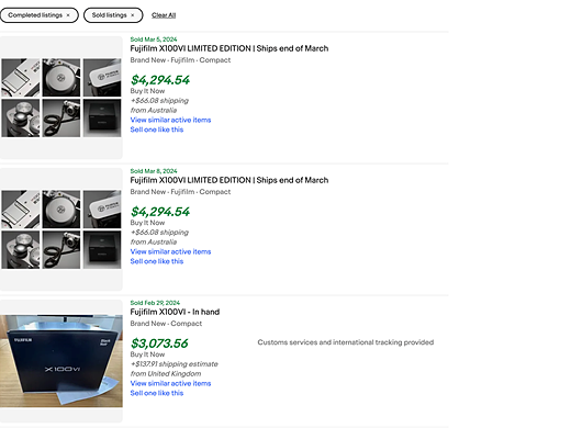 Other sellers are trying to make a quick buck by selling the regular model for $3,000 or more (list price $1,599). Several claim that the camera is “in hand,” which is possible since the X100VI is now shipping in small batches.