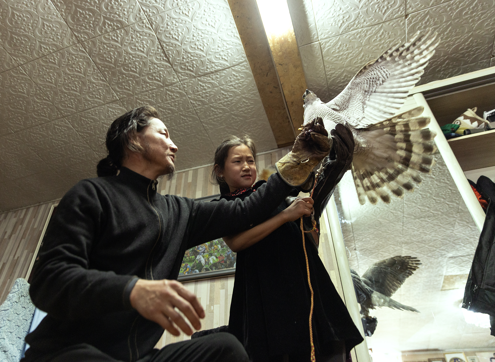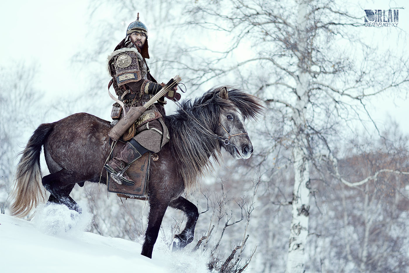Portrait by Ganzorig Miimaa of a Mongolian eagle hunter in traditional armor and fur hat standing beside his horse, holding a trained falcon against a dramatic cloudy winter steppe sky.