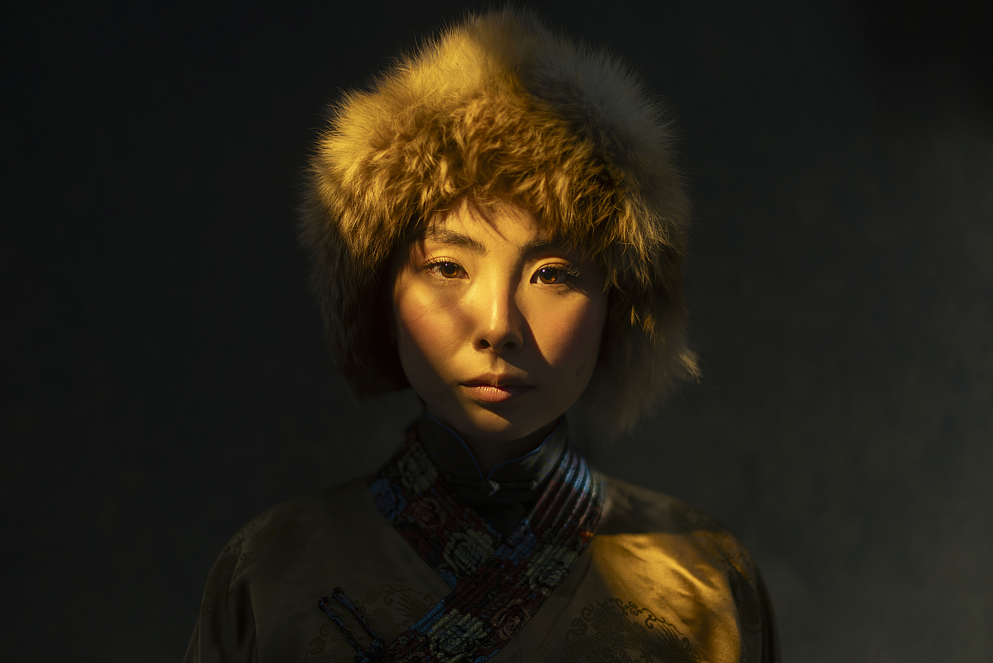 The hairstyle of a married Mongolian woman in the early 19th century is extremely fascinating. Many people mistake it for a hat or ornamental headpiece, rather than understanding it as a complex hairstyle. In this image, I chose to depict the final stage of the hairstyling process, bringing viewers one step closer to the cultural reality behind it. As for using the same fabric for the backdrop as the deel itself, I don’t feel the need to assign a deep symbolic explanation. It was not about meaning—it was about possibility.
