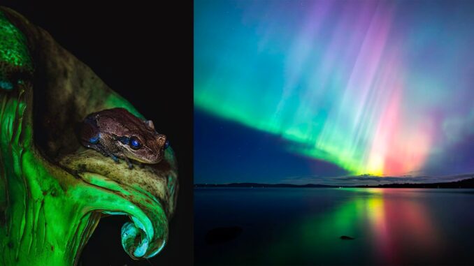 A photo of a biofluorescent frog sitting on a bioluminescent mushroom has won the People’s Choice Award at the Beaker Street Science Photography Prize 2024 based in Tasmania.