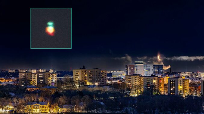 Swedish photographer and self-described amateur astronomer Peter Rosén witnessed a magnificent and rare sight in Sweden’s night sky on January 8. While watching Venus rise above Stockholm’s skyline, Rosén captured a colorful green flash around the planet.