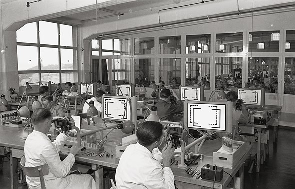 Checking and adjusting the image fields of the M3 illuminated frame rangefinder, approximately 1953.