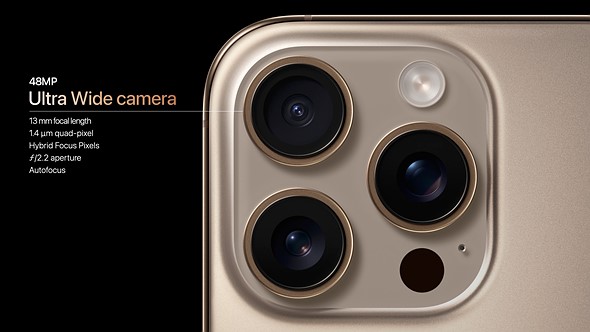 The iPhone 15 Pro’s 0.5x, 13mm equiv. F2.2 ultrawide camera uses a 12MP, 5.6×4.2mm sensor and produces broadly disappointing photos. While the ultrawide camera on the iPhone 16 Pro appears to be using the same size sensor, it’s now using 48MP quad-Bayer technology.