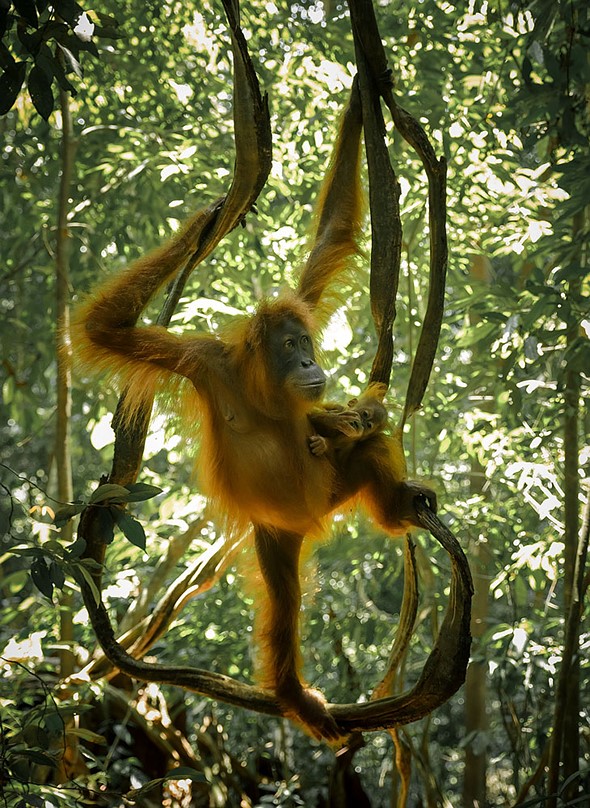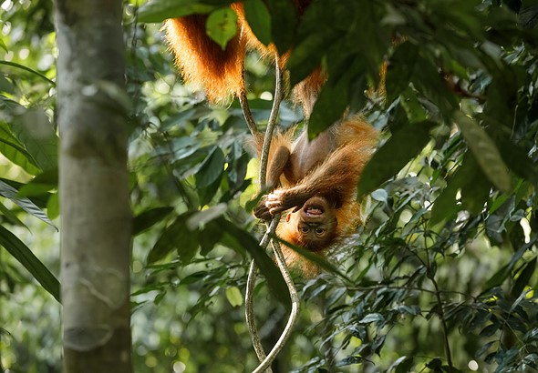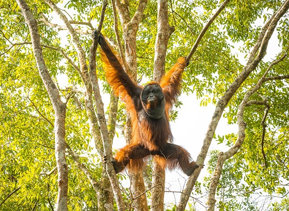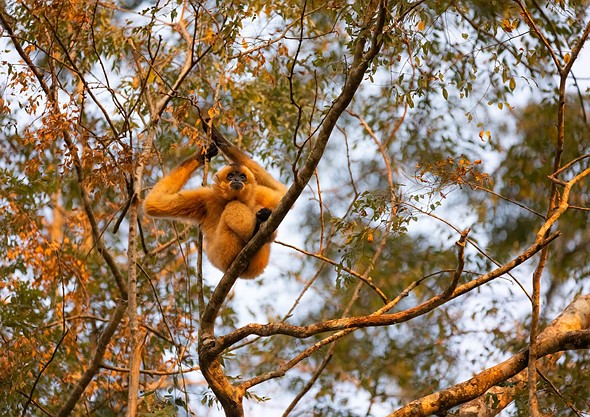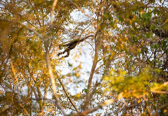 A male yellow-checked gibbon leaping between tree branches high in the canopy. Canon 5D4, Sigma 150-600mm |