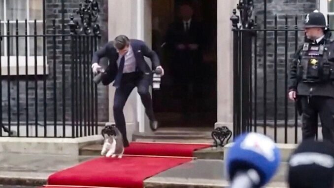 Larry the Cat, Chief Mouser to the Cabinet Office at the British Prime Minister’s office, tripped up a photographer as he attempted to exit Number 10 Downing Street on Tuesday.