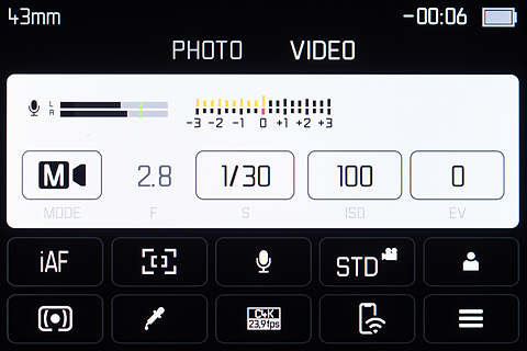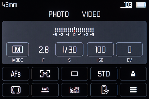 The Q3 43 has the most recent version of the interface Leica has been evolving for the past few years. As on the Q3 and SL3, pressing the menu button brings up a quick settings screen showing the exposure settings at the top and an array of other camera settings below. This display is touch-sensitive and swiping left brings up a similar quick settings menu but for video settings, taking you into video mode.