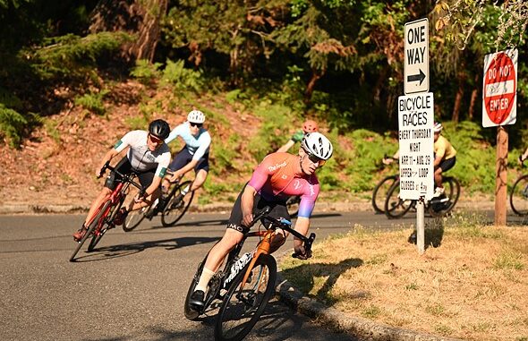 | Bikers rounding the corner during a bike race in the Seattle summer. The evening provided some excellent lighting and a chance to test a camera’s autofocus tracking skills. Photo: Richard Butler |