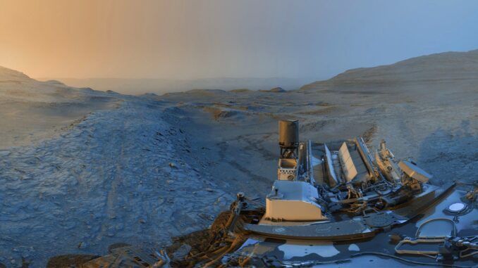 NASA’s Curiosity Mars rover used its black-and-white navigation cameras to capture a panorama made up of photos taken at two different times of day on November 18, 2025. Although on the Red Planet, that time period spanned both the 4,722nd and 4,723rd Martian days, or sols.