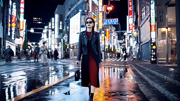 A frame grab from an AI-generated video OpenAI created by entering the following prompt into Sora: “A stylish woman walks down a Tokyo street filled with warm glowing neon and animated city signage. She wears a black leather jacket, a long red dress, and black boots, and carries a black purse. She wears sunglasses and red lipstick. She walks confidently and casually. The street is damp and reflective, creating a mirror effect of the colorful lights. Many pedestrians walk about.” AI video credit: OpenAI |