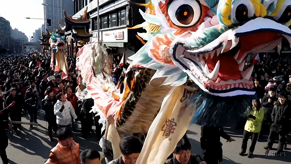 Among all the videos shared by OpenAI, there is one that alarms me most. A ten-second Chinese Lunar New Year celebration clip shows a large crowd gathered for a parade, flanking both sides of the street as two dragon puppets participate in a dragon dance down the center.