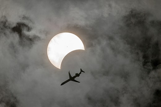 “Shot with a 10 Stop ND filter,” philmar writes, “A plane fortuitously passed through the frame. I did notice plane until I reviewed my shots in Lightroom. Toronto experienced 99.95% of the eclipse but was under thick cloud except for about 20 minutes.”