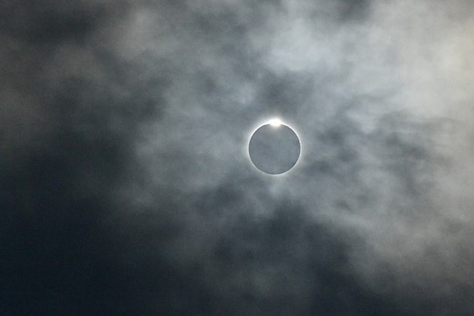 This scene with backlight clouds was taken just after totality, as the moon moves past the sun. It was taken in Frisco, Texas, with a Canon 5D Mark III and Canon EF 70-200mm F2.8 IS II USM lens.