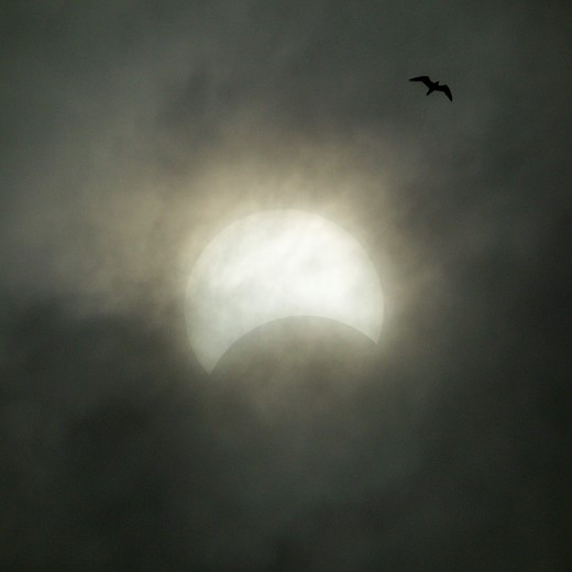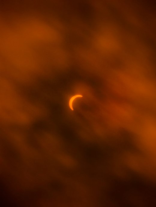 A partial solar eclipse, as seen from cloudy Winnipeg, Manitoba, Canada. The image was made with a Nikon 1 V1 with an FT-1 adaptor, Nikon 70-200 and Nikon TC -14E II, for an effective focal length of 756mm. The image has been cropped and resized for sharpness in Adobe RAW.