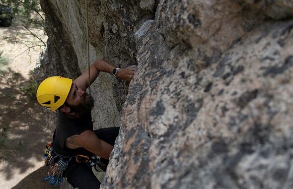 Kenyon climbing Bolt Gun, 5.11b – we thought we were setting the rope up on a much easier 5.10a.
