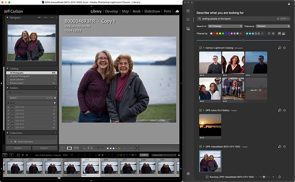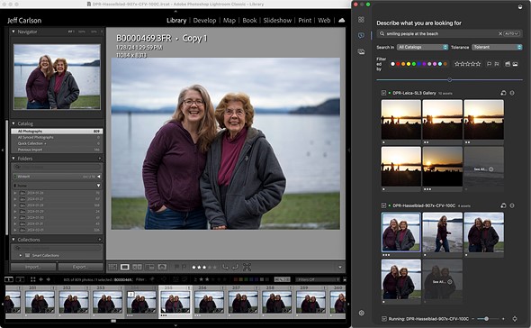 | A text search for “smiling people at the beach” brings up photos from multiple catalogs. Lightroom Classic is on the left, and Peakto Search is in its own floating window at right. |