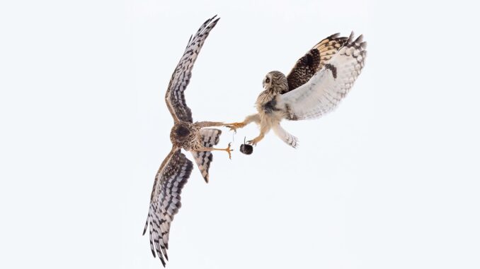 Photographer Henrik Nilsson captured amazing action photos as a marsh hawk, also known as a northern harrier, roused a short-eared owl and stole its meal in mid-air.