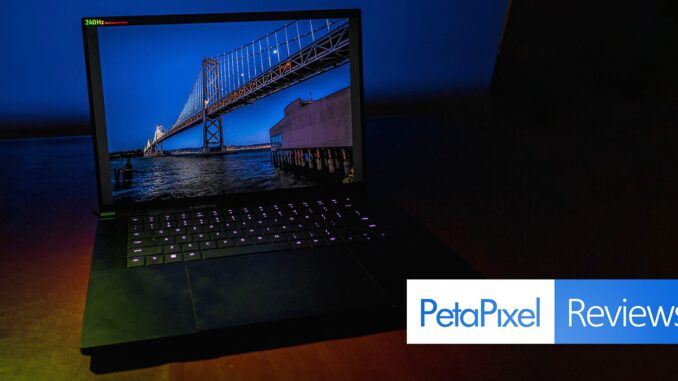 A laptop with an illuminated keyboard is open on a dark surface. The screen displays a vivid image of a bridge over water during twilight. "PetaPixel Reviews" is written in a blue and white banner at the bottom right corner.