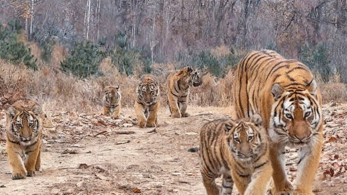 In a landmark moment for wildlife monitoring, trail cameras in Northeast China have captured never-before-seen footage of a wild Siberian tigress with five cubs — the first time such a large tiger family has ever been recorded on camera in the country.