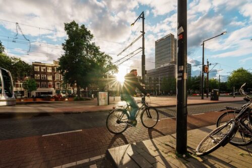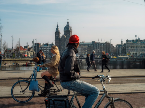 Bicycle City Rhythms – Amsterdam in Motion: Amsterdam’s city centre, where bicycles create an endless rhythm, connecting visually with the distant church.