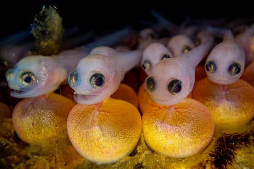 Artist statement: Baby plainfin midshipman fish, still attached to their yolk sacs.