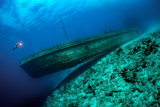 Artist statement: A scuba diver looks tiny swimming in front of a shipwreck.