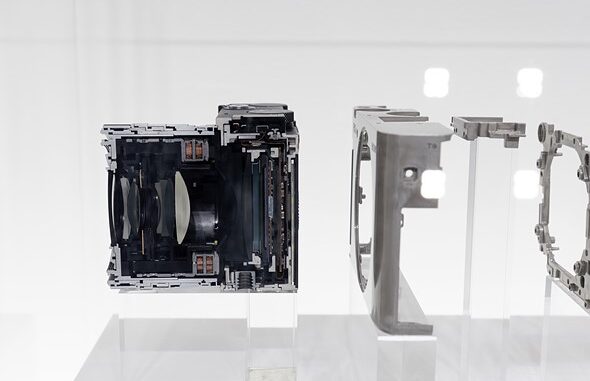 A Sony RX1R III cut in half in a display case at CP+. The lens sits almost directly on top of the sensor, requiring precise, micron-level adjustments for each unit to ensure sharp image quality. Photo: Dale Baskin |