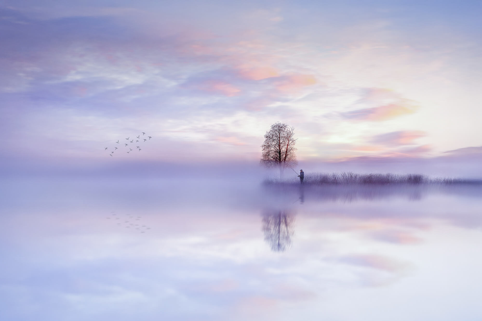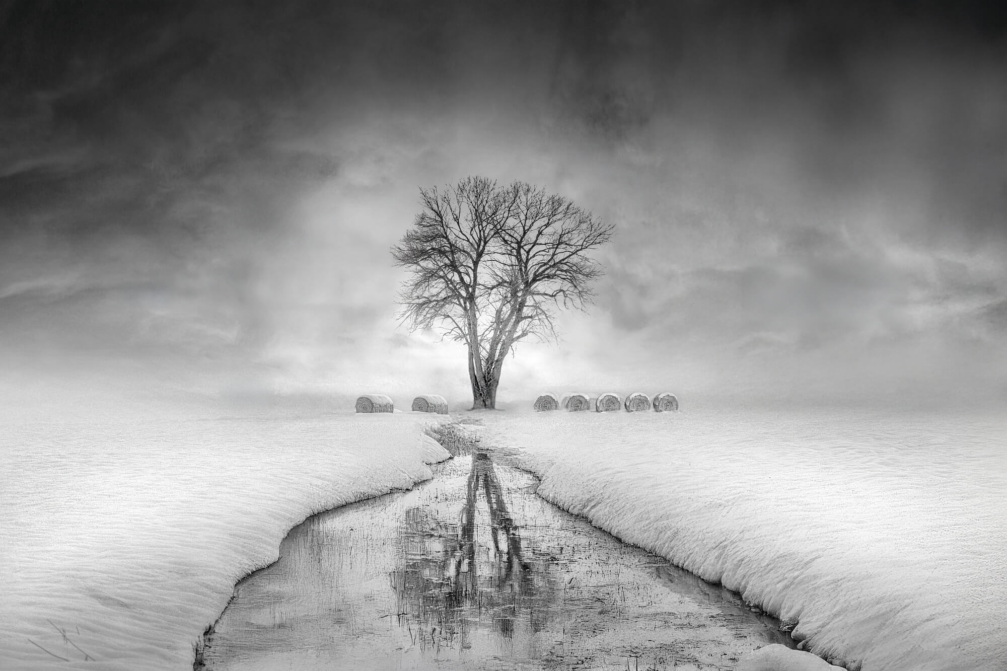 Stefan Fischer minimalist winter landscape with footprints leading to a lone tree and house in fog, showcasing quiet atmosphere and dreamlike composition