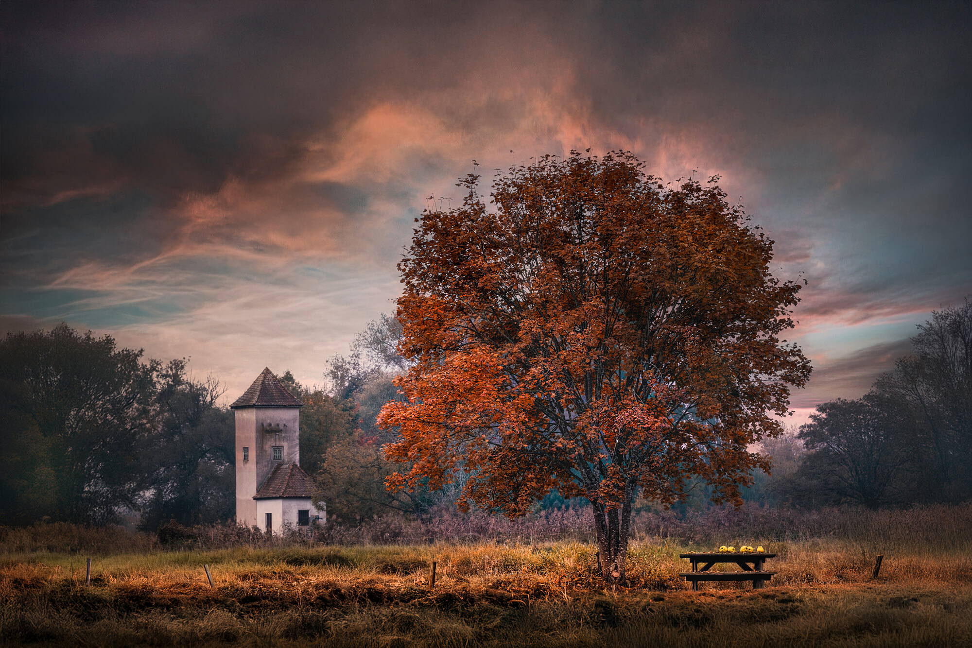 Stefan Fischer surreal autumn landscape with a lone figure under an umbrella framed by colorful foliage, highlighting dreamlike atmosphere and minimalist composition