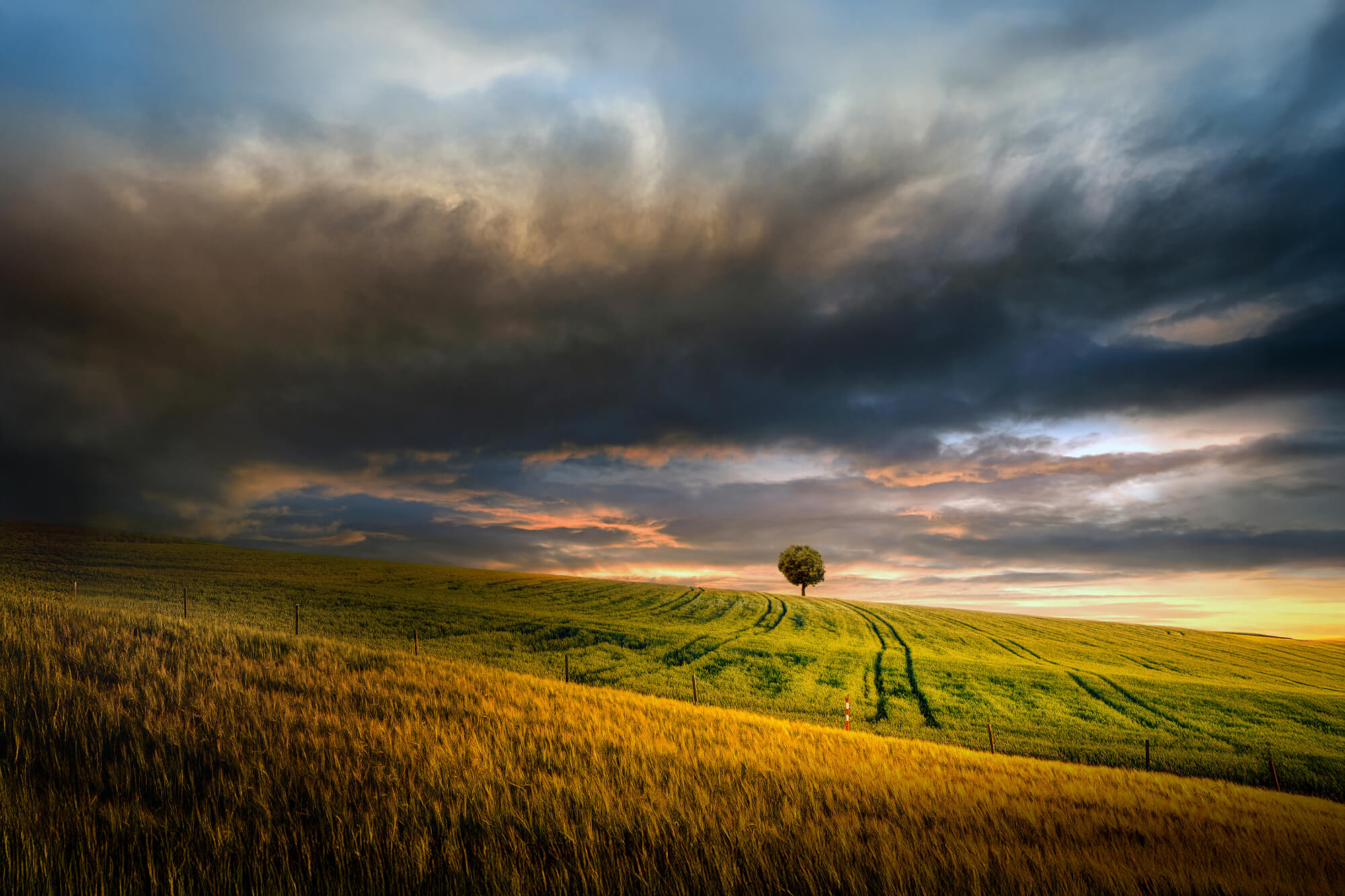 Stefan Fischer surreal landscape with a lone tree and chair in a golden field under dramatic sky, showcasing minimalist composition and dreamlike atmosphere