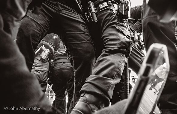 Abernathy also understands why the photos have resonated so much. “I’m most grateful that it’s become a focal point to bring attention to not only this area but what’s happening in the whole United States,” he says. “It speaks to freedom of the press. A lot of people are picking up on that for obvious reasons, but it speaks way beyond my personal experience. It’s freedom of the press, and it’s individual people trying to struggle against that massive power. Both his shot and my last shot show only legs in power positions. And they’re dominating, and there’s weapons, and it really represents a lot more.”
