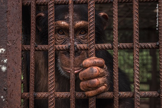 A rescued chimpanzee looks on from its enclosure at the Chimpanzee Conservation Center in the Republic of Guinea. Located in the National Park of Upper Niger, the center rehabilitates orphaned chimpanzees that have been rescued from being sold as pets after their mothers were killed for bushmeat. The goal is to release them back into the national park.