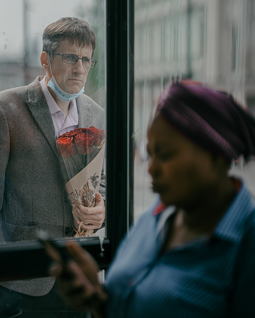 The apparent sorrow and loneliness of an isolated figure against the rain on the bus, the woman who is holding her head at the end of a long working day perhaps in reaction to what she has just experienced, and finally the man carrying roses with a surgical mask pulled down looking at the women who is oblivious to him at the bus stop – is that who the flowers were for? The love he lost.