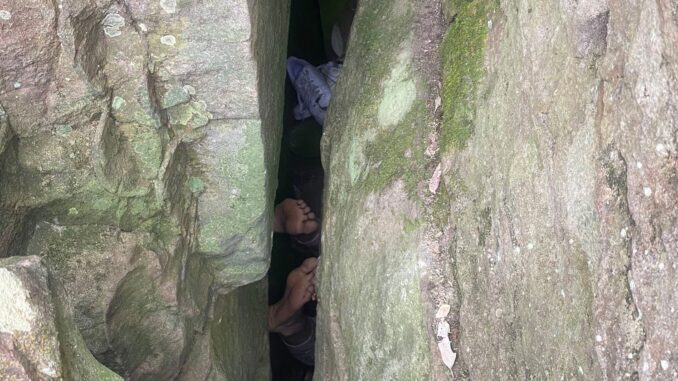 An unfortunate woman who dropped her phone while taking photos had to be rescued by emergency services after she got stuck between two boulders while trying to retrieve the device.